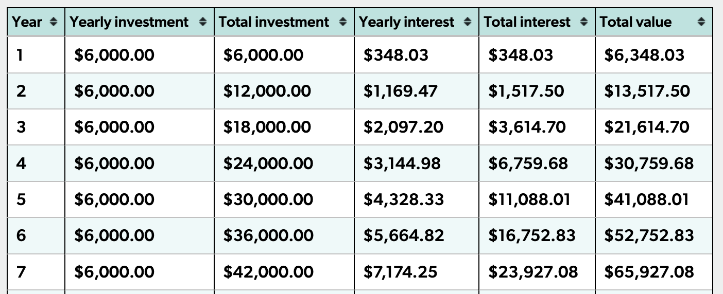 $500 a month making 12.94% compounded annually, this will happen in the 7th year.